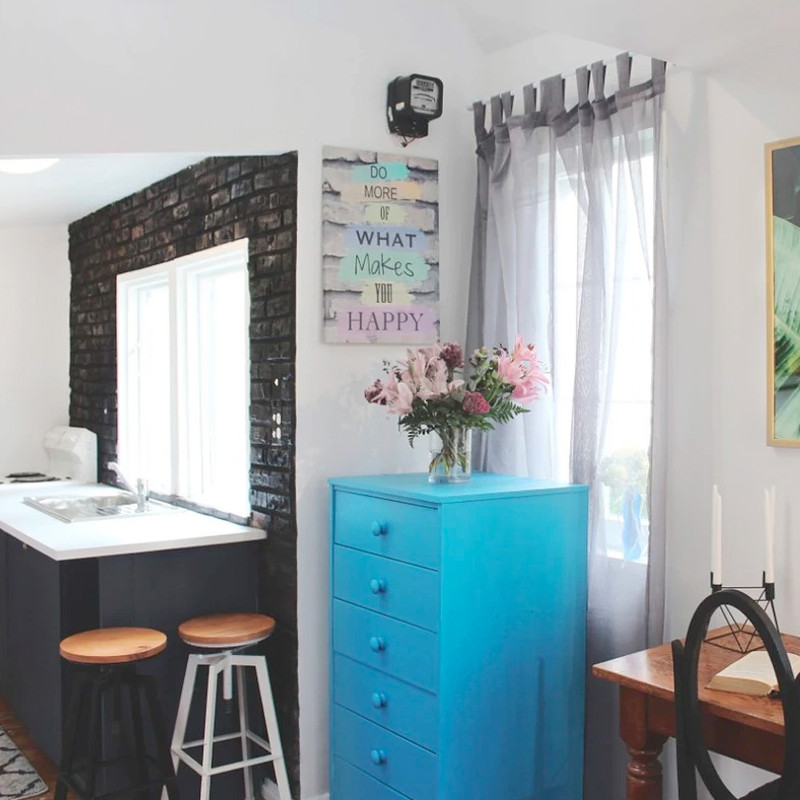 I love how the space was transformed with the bricks from Dreamstone. Due to the small size of the kitchen and the house itself, it was very difficult to come up with a wall finishing solution that would make the space feel bigger, not the other way around. Ancient Bricks became a perfect solution – they added texture to the wall, thus making it look more interesting and by painting bricks black I added depth to the space – extremely happy with the outcome!!